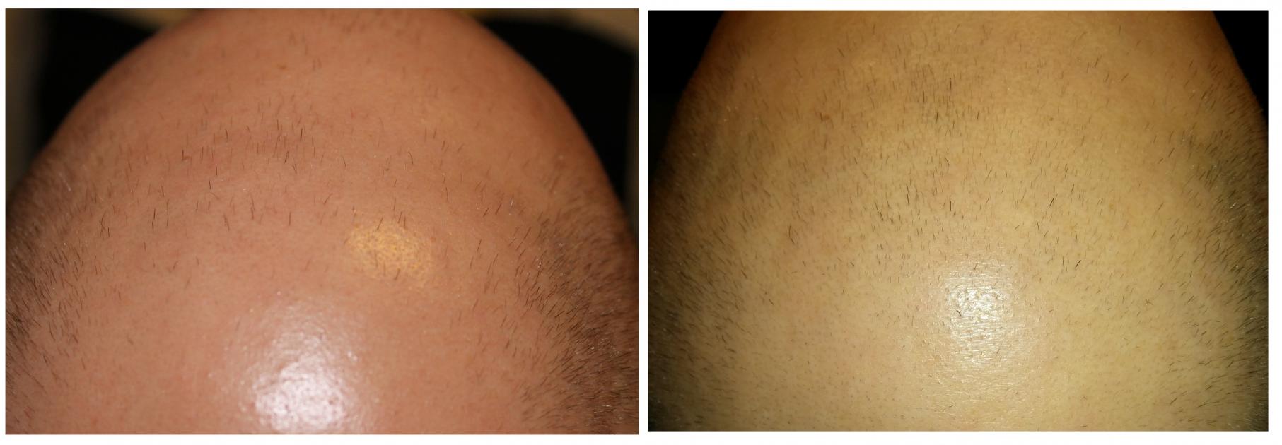 My progress in less than two months of dermarolling. I also started finasteride and minoxidil two weeks before I started rolling. I've shared the first pic before, but the second provides another view. The shots on the left are from 10/17 and on the right from 12/5. I think it's significant for this short amount of time, especially considering I had no luck a few years ago while on the big 3 for over a year. I only ever saw more vellus hairs back then.