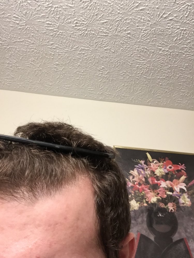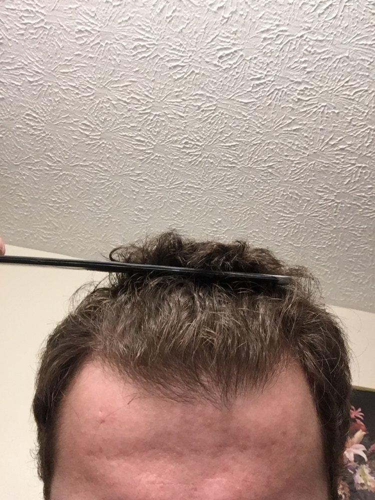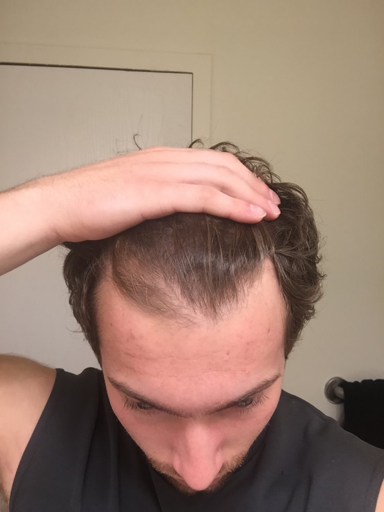I have curly hair so my hair characteristics make me appear to have a full head of hair. I curl my curly bangs over my hairline
