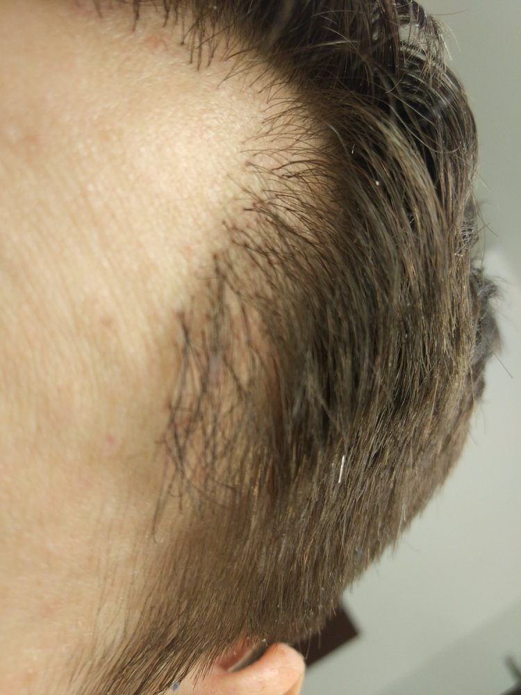 3. Left temple is MUCH thicker, the hairs are thicker, the density is much higher. I think there was some mess with grafts. Graft that should had go to the back line of right temple had went to the frontline of left temple for some reason.