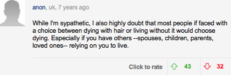 scientists even trying to cure hair loss when cancer is much worse." or