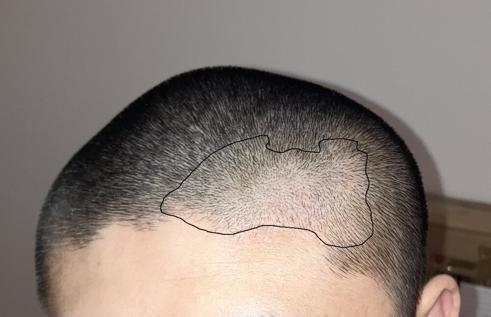 Experiencing thinning and diffusion primarily on one side only (see photo - I've outlined the affected zone)