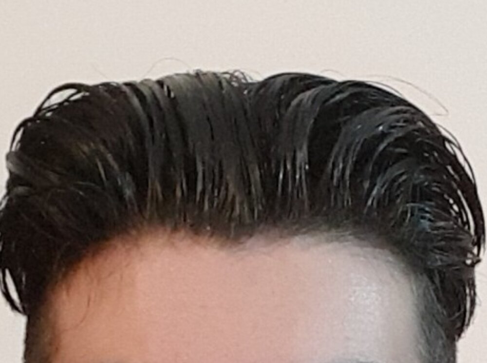 It clearly isn't a perfect, straight hairline, it's slightly shaped like a V as you can see.