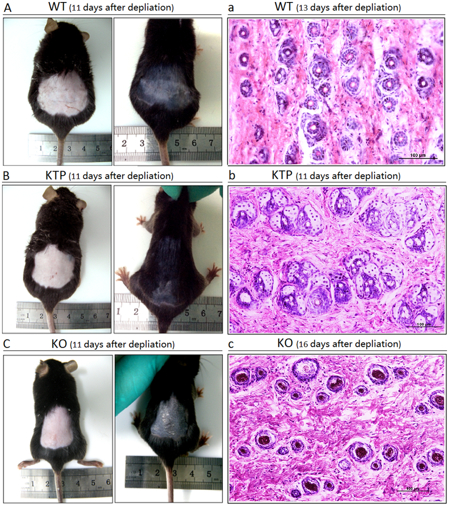 While it is apparent that Tβ4 plays a role in hair growth and its molecular mechanism is unknown. To explore the role of Tβ4 in HF development, we generated mice that overexpress Tβ4 in the epidermis (KTP mice) and Tβ4 global knockout mice (KO mice). Mechanistically, it has been shown that Tβ4 accelerates angiogenesis by increasing vascular endothelial growth factor (VEGF) expression [13], which may be secondary to the effects of Tβ4 on MAPK, PKC and WNT signaling [14]. Thus, we also explored the relationship between Tβ4 and VEGF expression in the skin, and dissected the underlying signaling pathways associated with this effect.