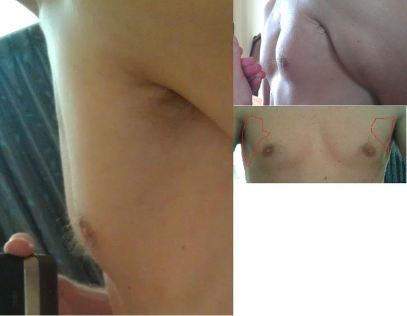 The highlighted area shows where I feel what may be better described as a rubbery mass underneath my skin...I do not feel this underneath or around my nipples in the parts not highlighted. Possibly a small amount over the top of my breast, but not of the same type of mass as the area highlighted. I run a lot, and noticed a large change in how much my breasts bounce while running....from almost non existant to quite a bit...I had to change running shirts actually. In the large photo, you can see the outward appearance starting to form...this has been getting worse. My chest was extremely flat, and I had two people comment on a slight difference in appearance already, but it's not super noticeable yet.