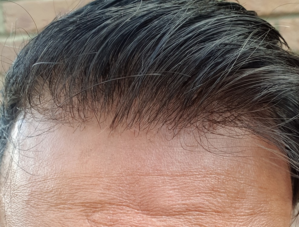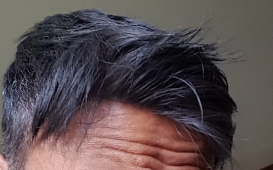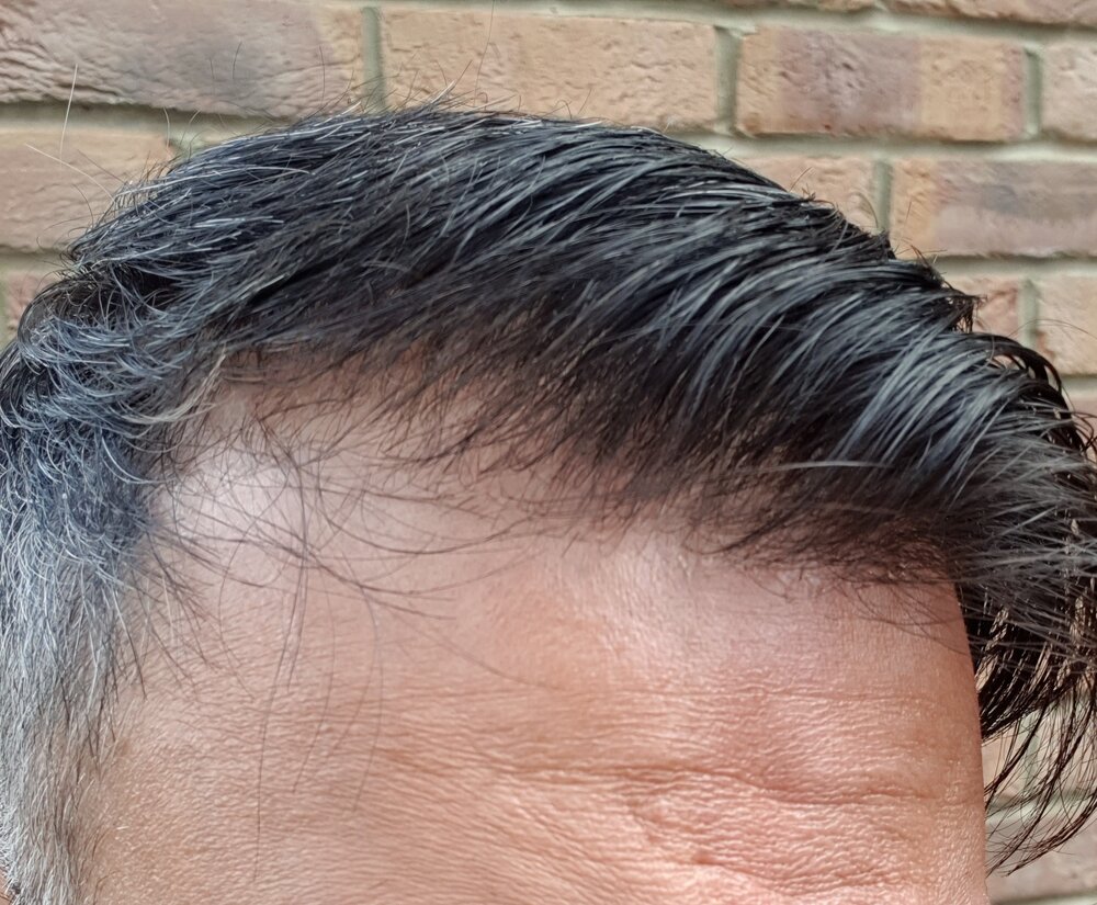 The other changes are that the rest of the hair is a mix of black and dark brown and some gray thrown in. This mix of colours breaks the hair up so that it doesn't look like like 'lego' hair. And the hairline shape is more v-shaped to give some impression of slight-recession. The density is light so that it suits my age a bit more.