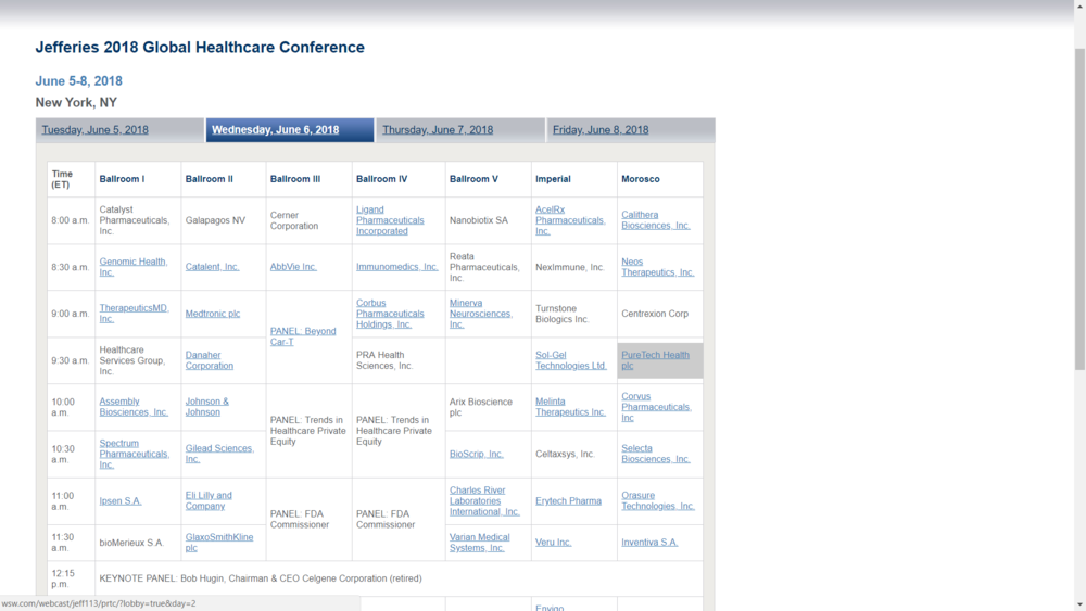 Do you know that Puretech Health will be Present at The Jefferies 2018 Global Healthcare Conference, this Wednesday (Tomorrow) 9:30AM EDT.
