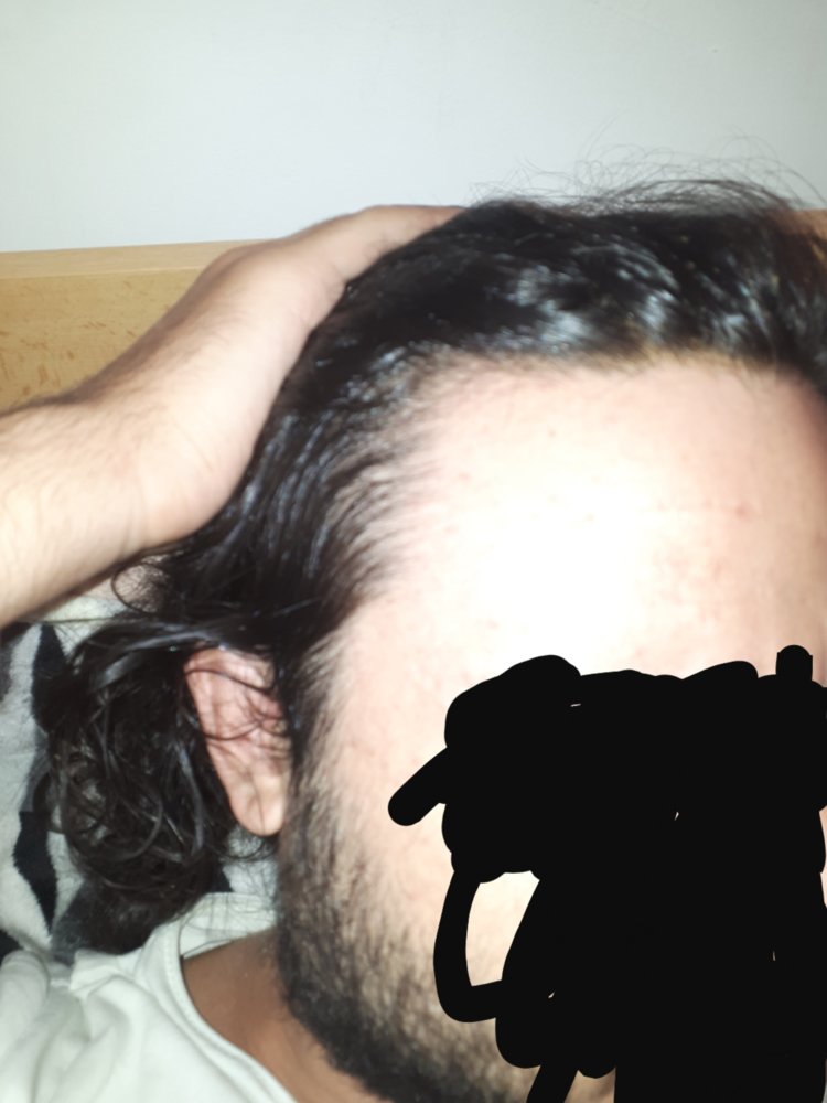 I feel sorry about you. On the photos I see your hair loss pattern is uneven like mine and not typical male pattern baldness. In male pattern baldness, both temples progress equally and sides aren't thinning unless in very advanced Norwood 7. You are at I'd say Norwood 2,2.5. And as i know the male pattern baldness first start with a small triangular recession which people call a mature hairline. Your juvenile hairline is still intact. It's just diffuse. Is your scalp itching? Mine is especially around the nape and around the crown. I saw some relief with apple cider vinegar but it's still there. Do you have dandruff? I still have dandruff flakes too. Here are photos to display what is happening with me. As you can see on the first photo, the right temple is intact, but on the second photo there is a slight recession on the left temple. There are tiny hairs popping out. They appeared a moth and half ago. Before this area used to be slick bald with only one hair left growing. On the third and second picture you can see the thinning much greater on the left side and it is hider to hide for me, and the thinning on the right side is milder.