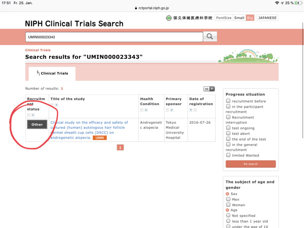 Remember when we were all afraid, when we saw that the trial had the status „terminated“ on the english version of the Japanese clinical trials website? They now changed it from „terminated“ to „other“ and when you open it, the recruitment status is „complete: follow-up continuing“. That corresponds to the Japanese „recruitment completed - test ongoing“.