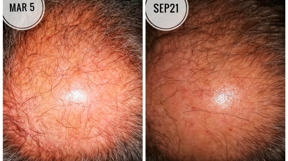 I think that i have just found my scalp twin.OK, it's been 9 months on sandalore for me. I last posted 6 months ago, saying my bald spot had shrunk a bit but it seemed to have stopped improving. Back in March I made 2 changes: I started adding 10 drops to 60ml minoxidil instead of 4, and I went back to 1.5mm dermastamping, which I had tried a couple years ago with no results.