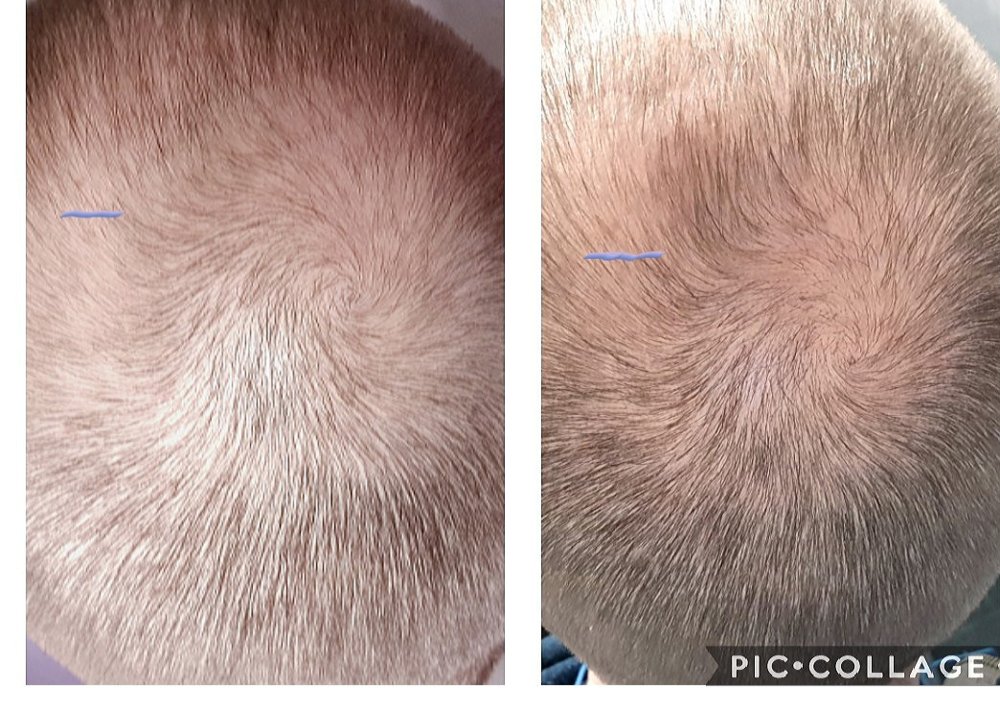 Almost 4 months in there are sections on my classic top central bald spot with new dark hairs showing (between 1 and 2 mm I estimate.