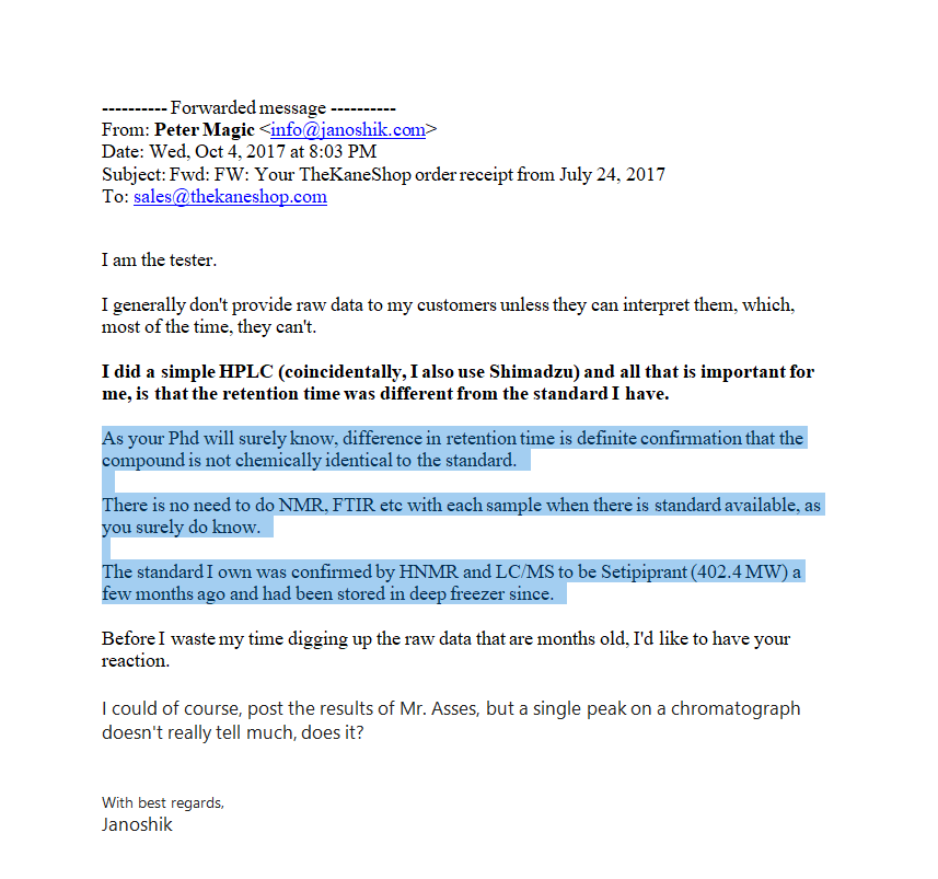 Some guy on this forum just PMed me and he just had his seti tested by janoshik and it was is not seti. The labtesters best guess is oxidized seti.
