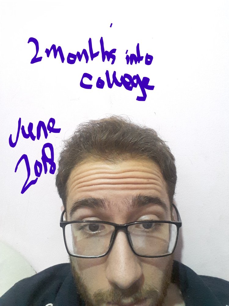 Didn't last long at all however, after exactly one month into college noticed shedding again and hair was considerably thinner ( didn't take pics so it still could be my imagination but since i was super paranoid I monitored every hair I lose or gained and the texture and density of my hair daily almost religiously ) but I still went on with the treatment for my entire first year because I was actually educated on how minoxidil works this time for once, I speculate my loss may be due to stopping using minoxidil for about a week straight, then only managing to use it once a day for the 5 days a week in which I had to go to college in. add in factors like stress and probably malnutrition since I've always been skinny and never ate except when I had to. gradually my doses became very messy, I sometimes used it once sometimes twice and so on, I had read somewhere online that since the half life of the drug is 22 hours it's safe to take it once a day so I just went with it.