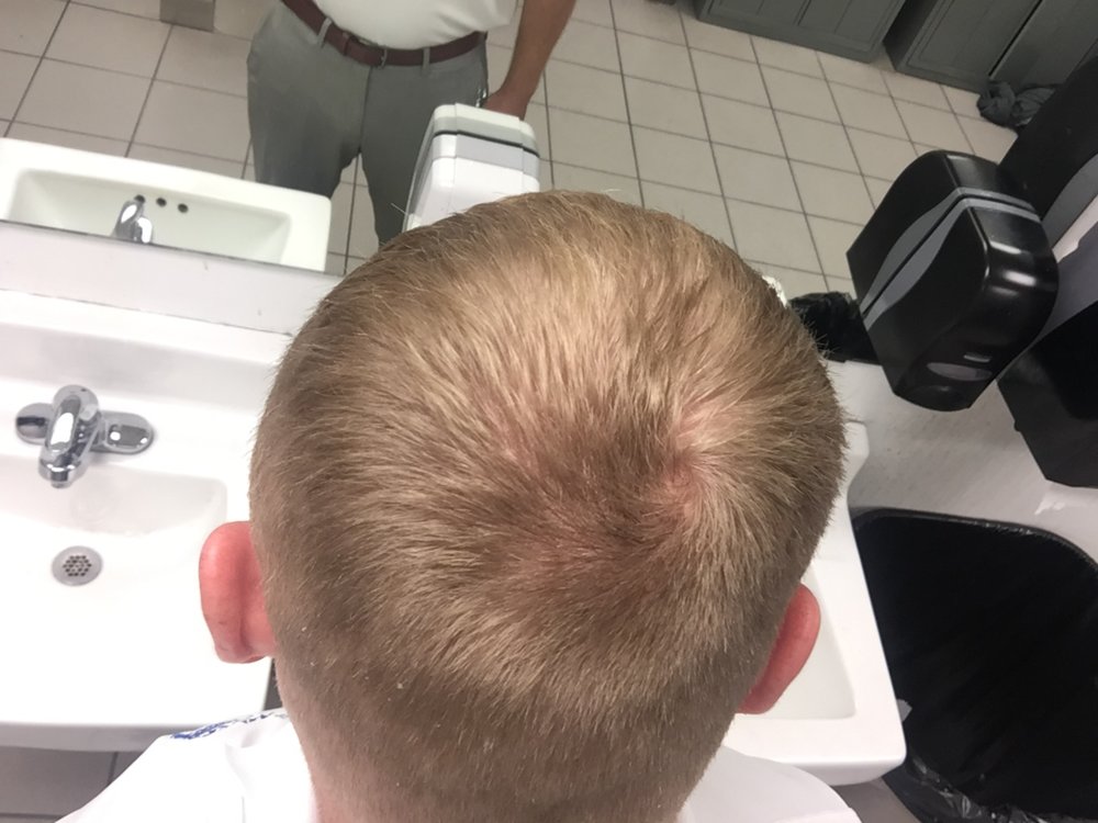 Hey guys, just wondering if it is time to see a doctor about my hair loss. I have a had a receding hairline since I wasn't about 16 (24 now). My dad was bald in his 30's. I was always ok with the receding hairline and honestly it didn't bother me. However, I just got my hair cut fairly short and noticed my hair looks like it's thinning on top in certain lighting or from certain angles. I can't tell if I never noticed this before and it's always been that way because of my cow lick by my crown, or if my longer hair was hiding my thinning hair. Let me know what you think! The first one was taken right after my haircut in the bathroom light that is harsh. The other two were a week later. I can't tell if he just miscut my swirl or if I need to see a doctor!