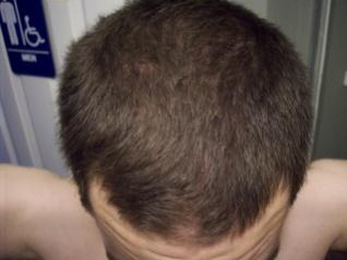 ( If anyone has any thoughts for me I'd appreciate them. If anyone wants to tell me I'm an idiot feel free I deserve it and maybe some other twit under the spell of hair greed will read it and be deterred fro doing what I did. If anyone has any hope for me I'd like to hear it. I've read about people growing back Avodart sheds, and I've read about people not growing them back. I don't know what will happen. I've been trying to calculate the half-life of 1 capsule of Avodart a week so I can get an idea when the drug should be mostly out of my system and my situation should stabilize. If anyone has any ideas I'd like to hear them. At such a low dose I figure it should be for the most part out of my system in couple weeks. Well here is the horror. I think it's obvious which one is the Avodart terror. The other one is the small patch I was trying to fill in. Talk about GREED. I hate myself. I would add though that that second picture was taken three years ago. It's just the best one I have. My small patch had gotten a -bit- larger in that time span so take that into consideration, but hardly by much. It was stable in every sense of the word. The shed as I said made my spot widen by a centimeter or more and go back a couple inches. And thin brutally. Nice big happy thick brown hairs I don't understand why.