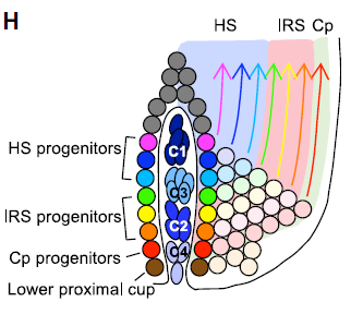 But this latest study found that Cxxc5 protein is negatively correlated with Wnt signaling activity. And in the human hair follicle to the left, Cxxc5 protein was most highly expressed near the bottom (i.e. Cluster 4) DPCs, where Wnt pathway activity is weakest.