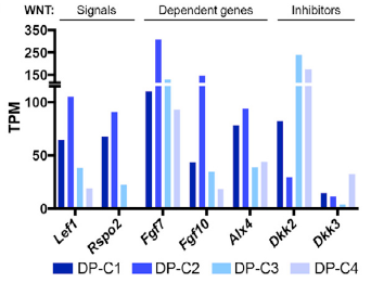From top to bottom, the DP clusters are Cluster 1 (C1), Cluster 3 (C3), Cluster 2 (C2), and Cluster 4 (C4). Expression of Lef1, a Wnt target gene, is a good marker for Wnt pathway activity. Lef1 expression is highest in Cluster 2, as are Wnt target genes Fgf7, Fgf10, and Alx4. Cxxc5 mRNA expression is also highest in Cluster 2.