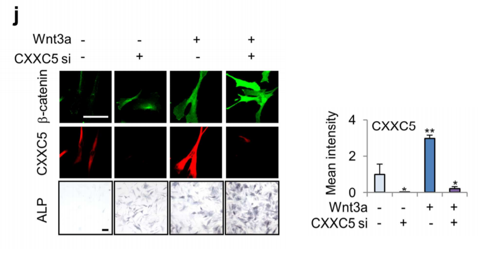 But in their in vitro experiment, they found that treatment of DPCs with Wnt3a strongly induced Cxxc5 protein expression - this seemingly contradicts in vivo data showing an inverse correlation. It does, however, agree with in vivo single-cell transcriptome data showing a positive correlation between Wnt signaling activity and Cxxc5 mRNA.