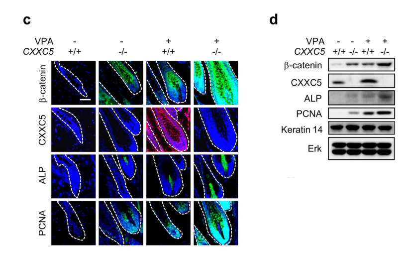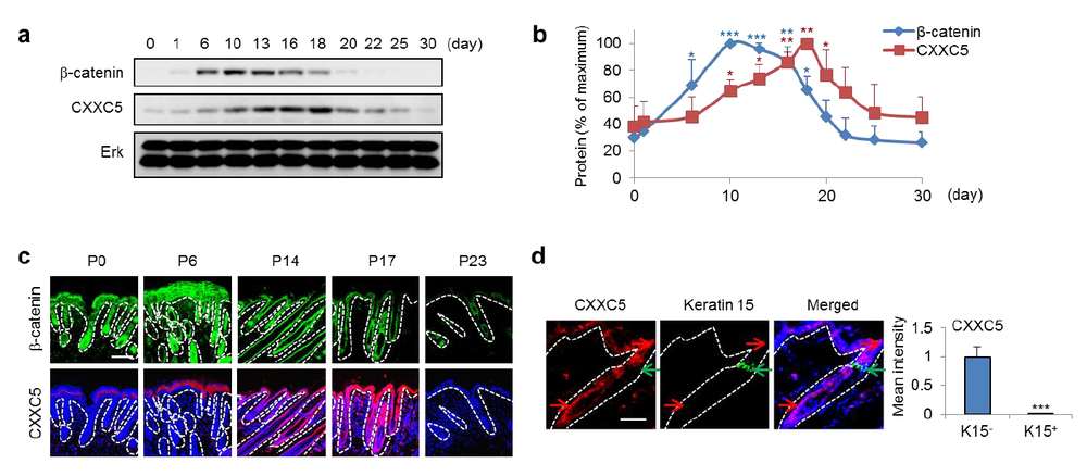 Here's a figure from the supplemental info showing expression of beta-catenin and Cxxc5 protein through the hair cycle:
