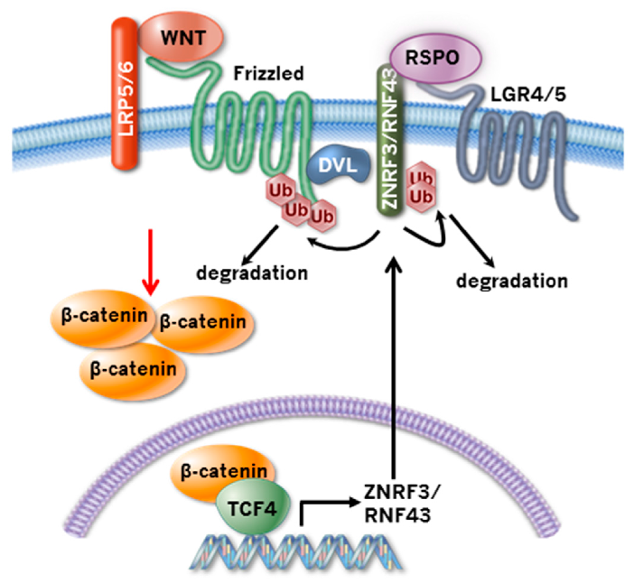 Znrf3 and Rnf43 are transmembrane E3 ubiquitin ligases that promote the endocytosis and proteasomal degradation of Frizzled (the Wnt receptor). Znrf3 and Rnf43 are both themselves Wnt target genes (much like Cxxc5), and therefore act as negative feedback regulators of Wnt signaling (also like Cxxc5). There's a family of secreted growth factors called R-spondins (RSPO for short). R-spondin forms a complex with its receptor Lgr4 or Lgr5 and with Znrf3/Rnf43, and when this happens, it's the Rspo/Lgr/Znrf43 or Rnf43 complex that undergoes proteasomal degradation. As a result, Wnt signaling persists much longer, and is much stronger.