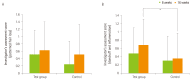 Figure 6A). Regarding the patient's satisfaction on the improvement of dandruff and inflammation of the scalp, the mean score at week 8 was 2.21 ± 1.02 for the test group, and 2.02 ± 1.07 for the control group (p > 0.05), and the scores after 16 weeks of consumption were 2.65 ± 1.04 for the test group and 2.13 ± 1.05 for the control group, the scores given to test group and the control group did show a difference (p = 0.042) (