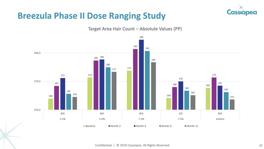 Lets not all forget that after 12 months the maximum strength BID dose regrew 4 hairs total and the minimum strength regrew 1 total hair. Every time I get close to dumping my money into a bunch of CB I revisit this graph. I get that it's a maintenance drug, but I have no doubt that if they extended this study into 24 months, every group would be in the negative.