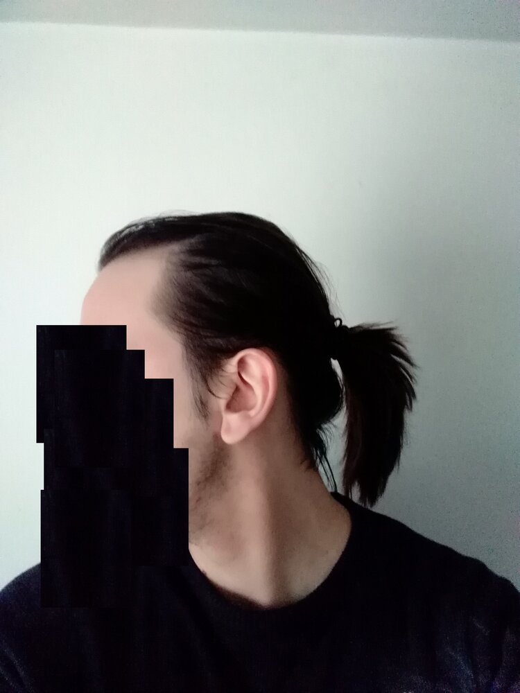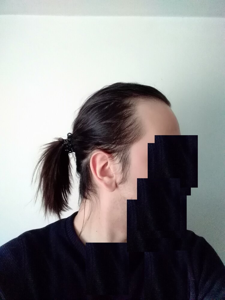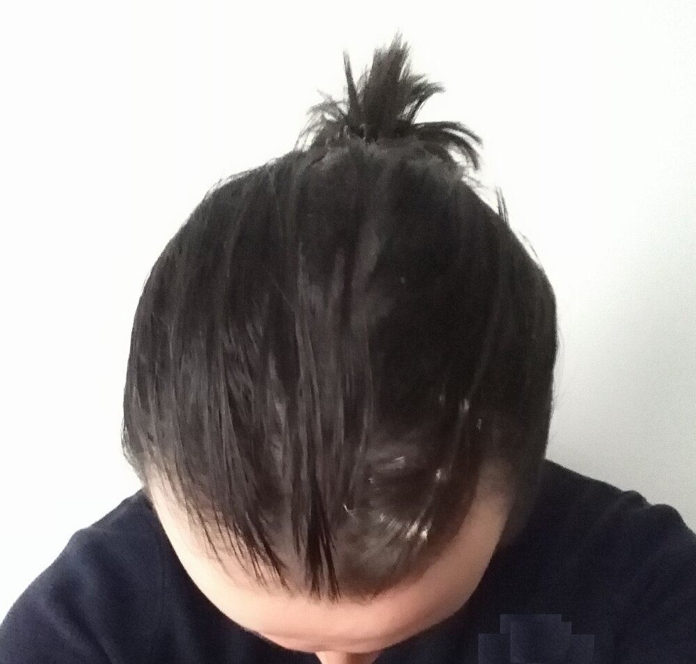 I have long(ish) hair, as you can see in the pictures below, so unless I wear a tight ponytail (which I never do anyway), any thinning/balding is completely unnoticeable, as I have no noticeable thinning on the crown, only temples.