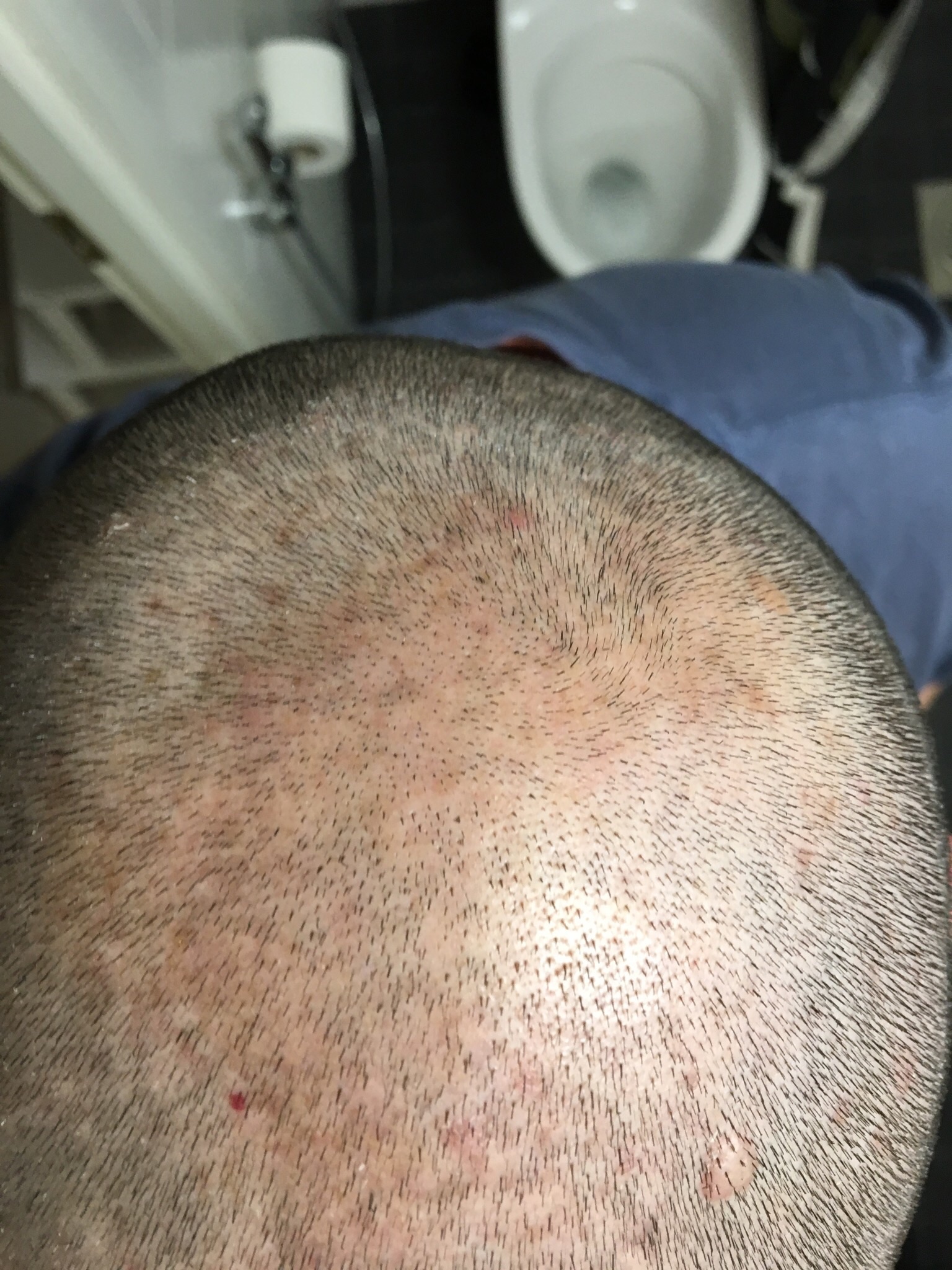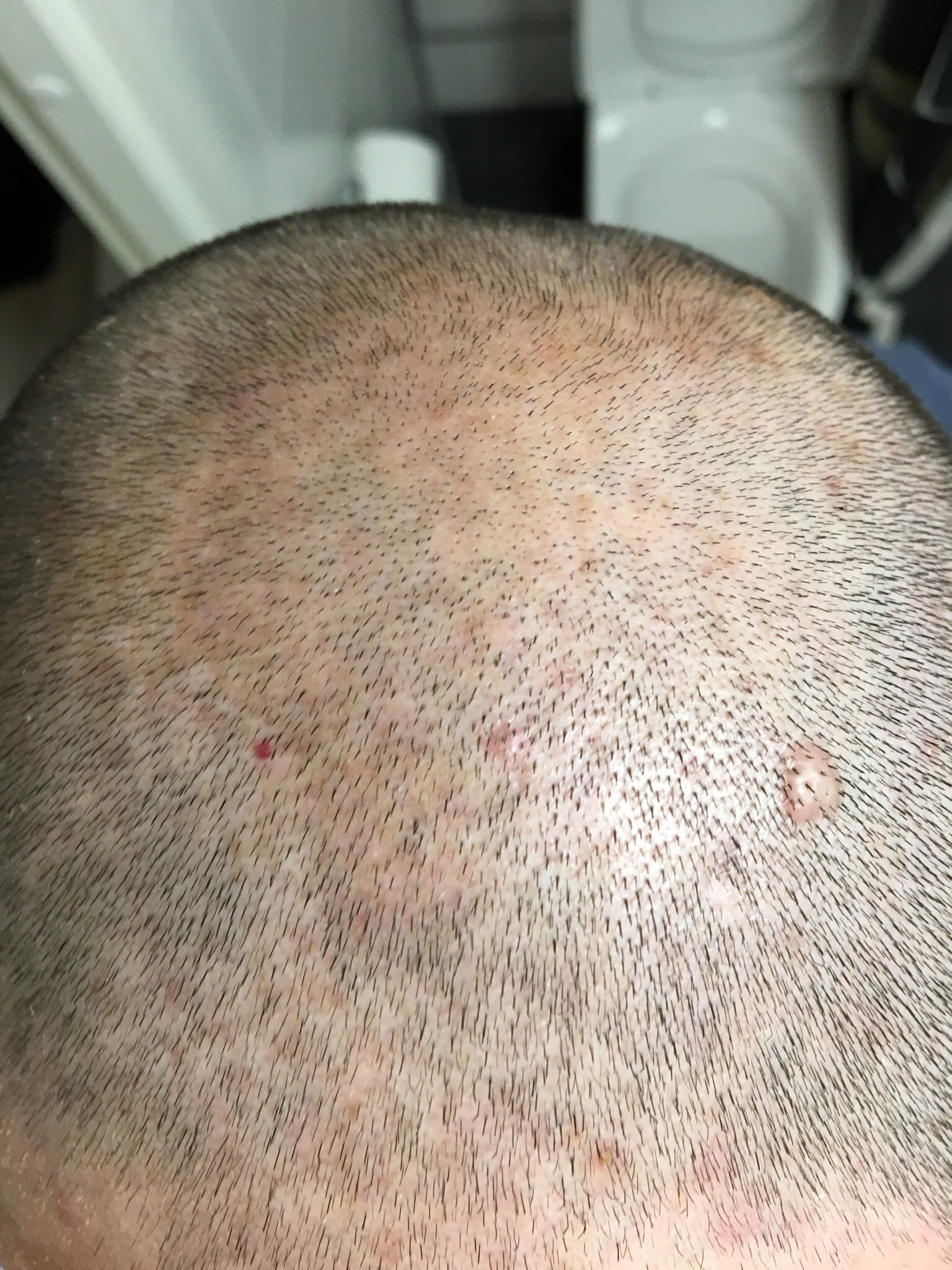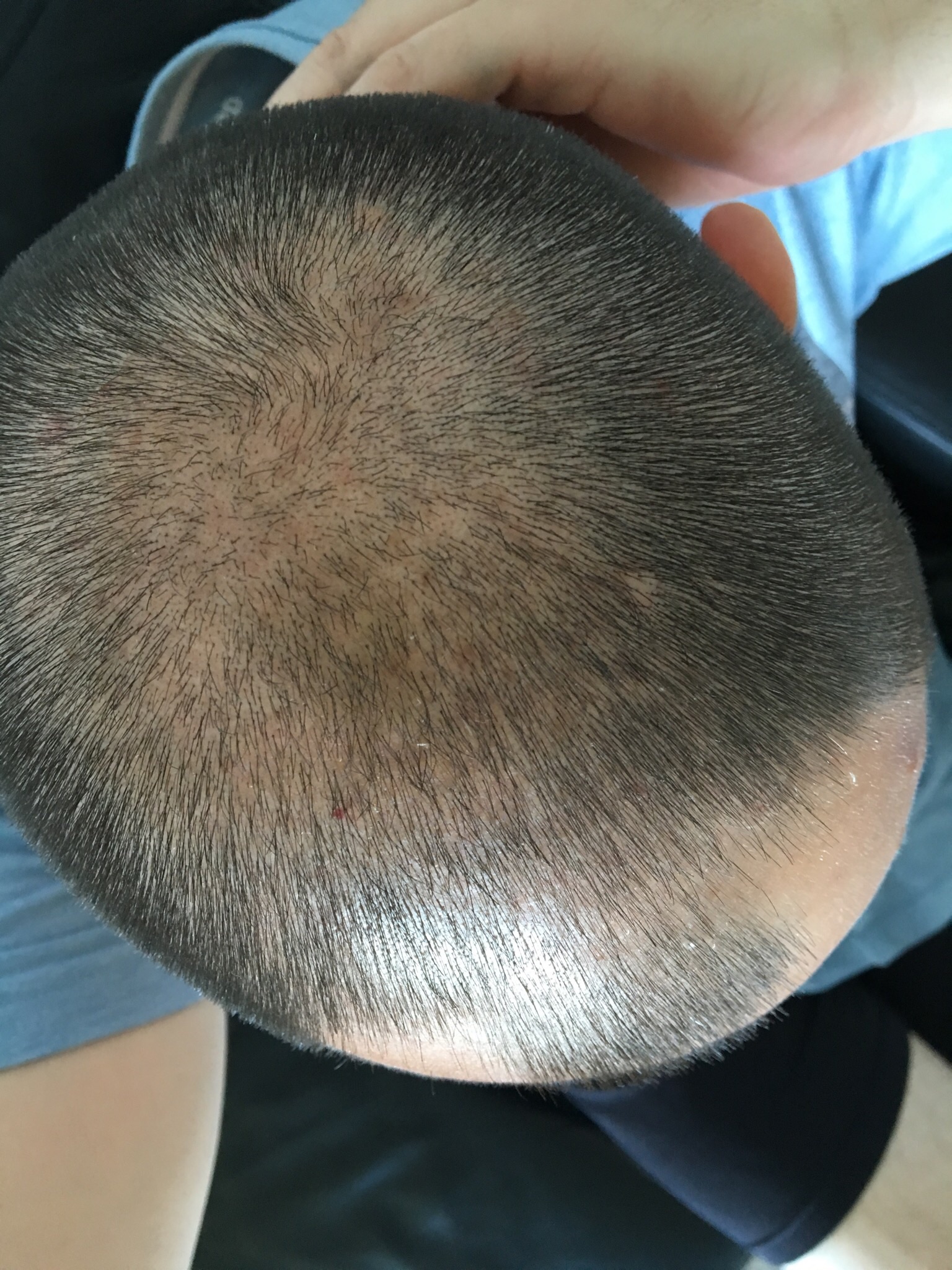 I have been on .25mg Propecia daily for 14 months and just buzzed by hair down to zero guard to see where I am at. I have noticed lots of tiny prickly thick hairs poking through the skin plus lots of black dots /hairs beneath the surface.
