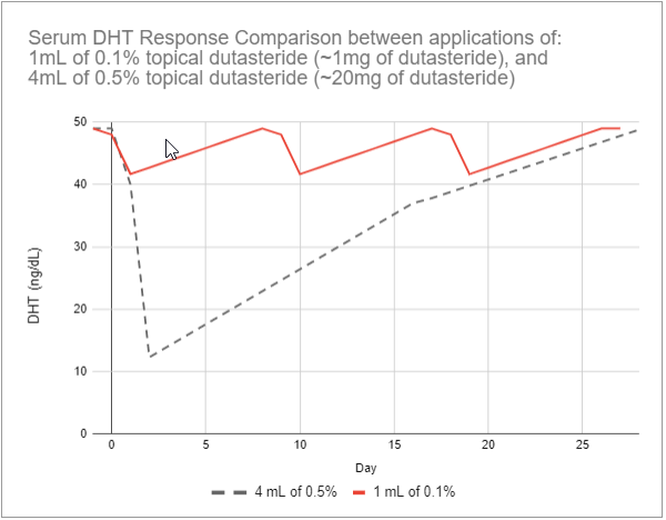 Things are looking bright. Corkmeister was able to dig up a study from Olsson Gisleskog who worked for GSK at the time. From the graphs, one-time usage of 0.1 mg of oral dutasteride has only blocked around 30-40% of serum DHT which recovered fully after a week, the dutasteride also gets out of the system in less than a week. From this, as long as our topical applications don't result in more than 0.1 mg systemic absorption, we are in the saw palmetto territory orally while possibly having a similar efficacy to oral finasteride in the scalp.