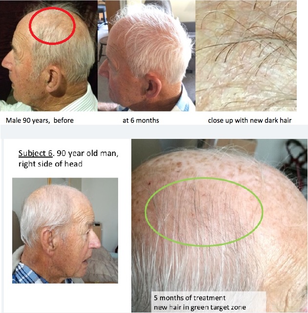 Honestly you can see in the photo a lot of the "new" hair in the front of his head was there before, but the lighting is deliberately done from the opposite side in the second photo to make it stand out more. Textbook stuffAnother thing with the 90 year old male, at 5 months he has basically the same bald look crown look than at the beginning of the tests, but at the 6 month mark he has a 'full' head of old man hair, which appears completely white out of a sudden, even though the lotion is supposed to pigment your hair.