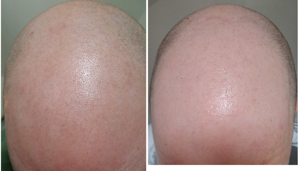 Not same light, angle and hair length. Too soon to be able to know if it works and if I will be able to recover something that will be cosmetically significant, but this is an interesting experiment.