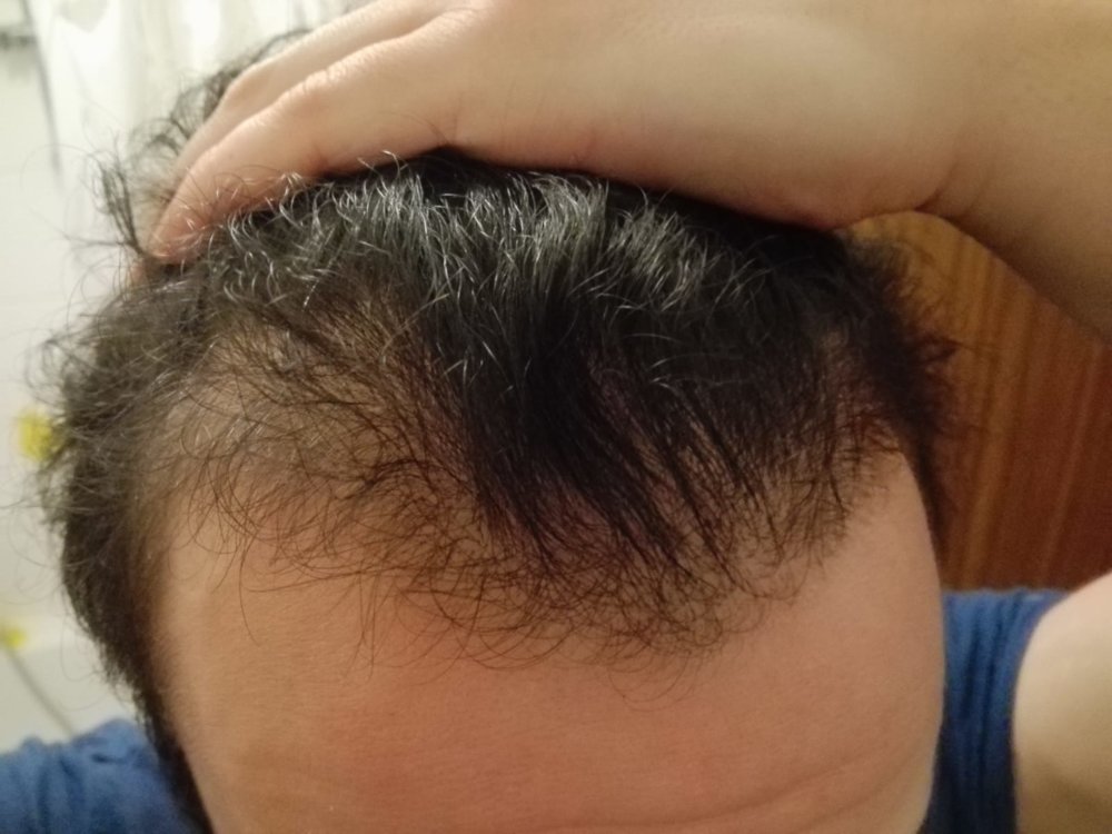 Month 7: Shedding reduced abruptly, probably by 80%, entire scalp is several shades darker as seen in the pictures. Very visible improvement of hairline and overall density.