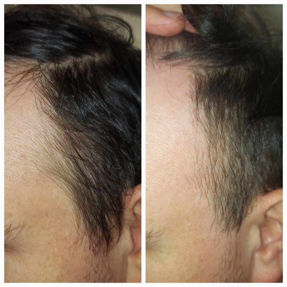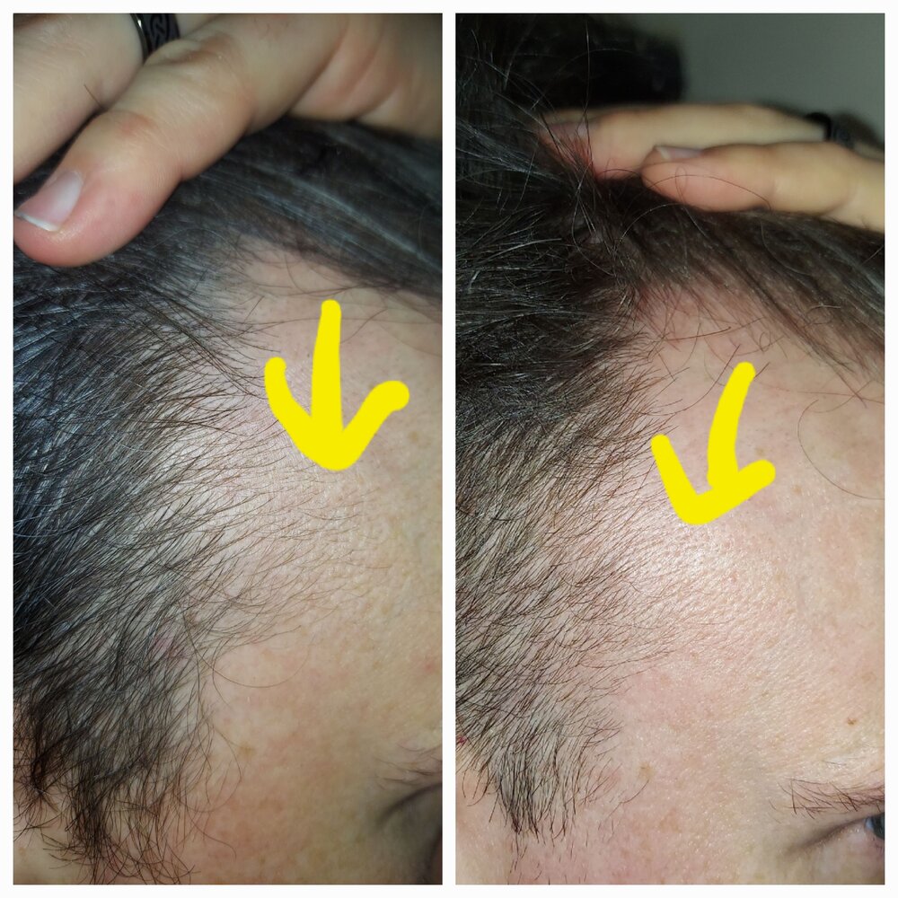 Have 2 pictures to compare some early results. This is usually where I see the first results of this program. Right at my temple peaks. There could be regrowth elsewhere, but it is hard to tell with the length of hair I have.