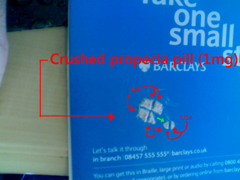 Anway, after studing the inhibition curve a bit more closely i came up with the idea of crushing a propecia pill into a powder then measuring 1/16 as accurately as possible. According to the chart that I edited, 1/16 of a propecia pill will inhibit DHT by about 25%. Assuming the curve is accurate.