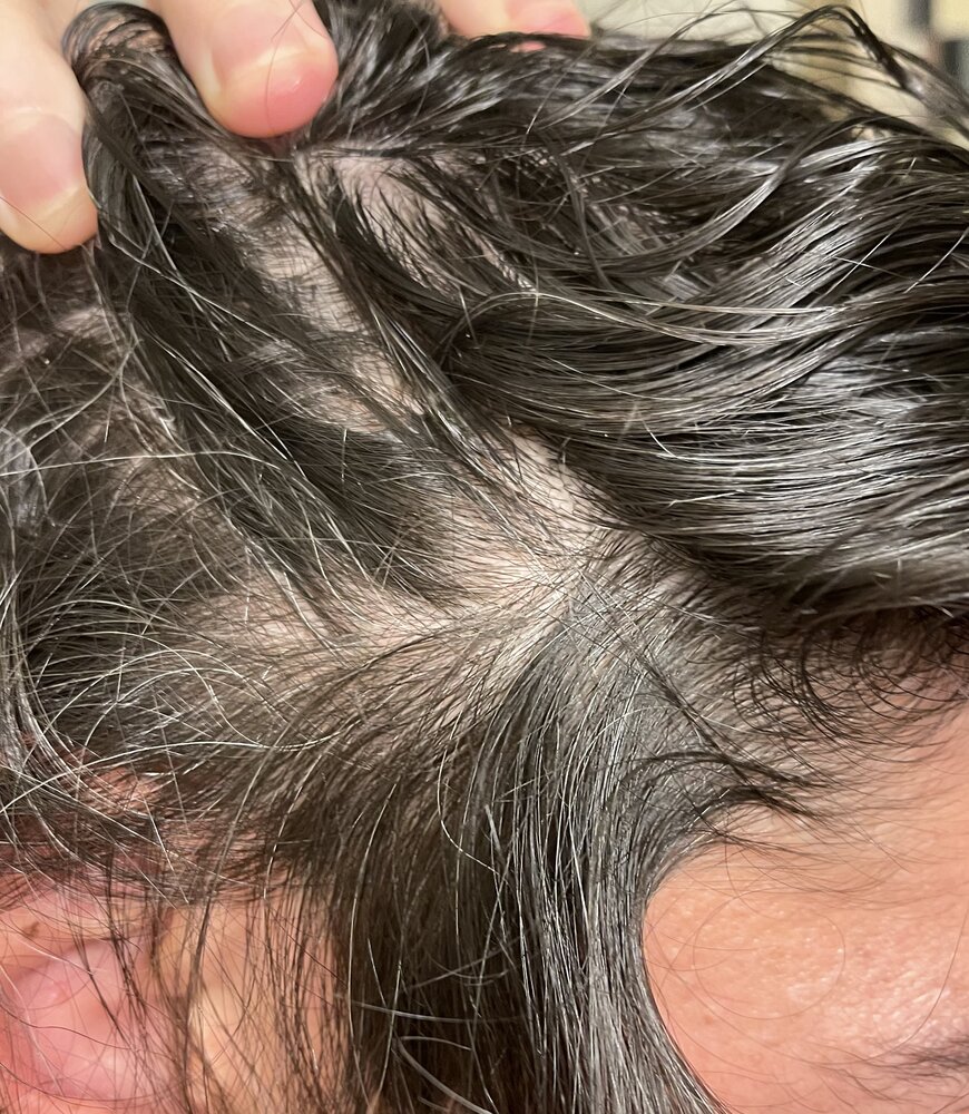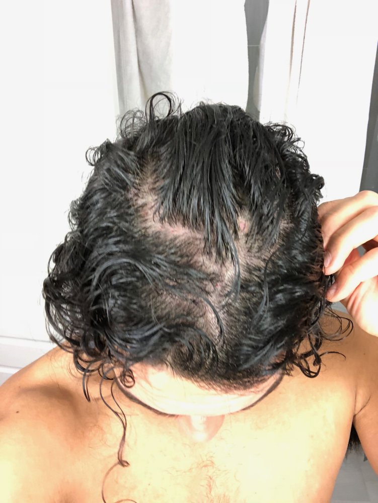 Here's a photo I took of my hair a couple of months ago. My hair is wet and has a deliberate part. I guess the biggest difference between our situations is that I began losing my hair when I was 18 (so 22 years ago now). I have had 3 hair transplants to bulk the hairline though.