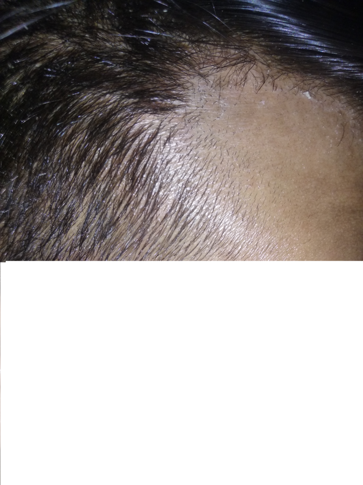 There wasnt any hair there. slick bald. Sure I will clear itEarly on it is sometimes difficult to distinguish what is regrowing and what is miniaturizing/shedding, would need older pics from the same angle to compare.