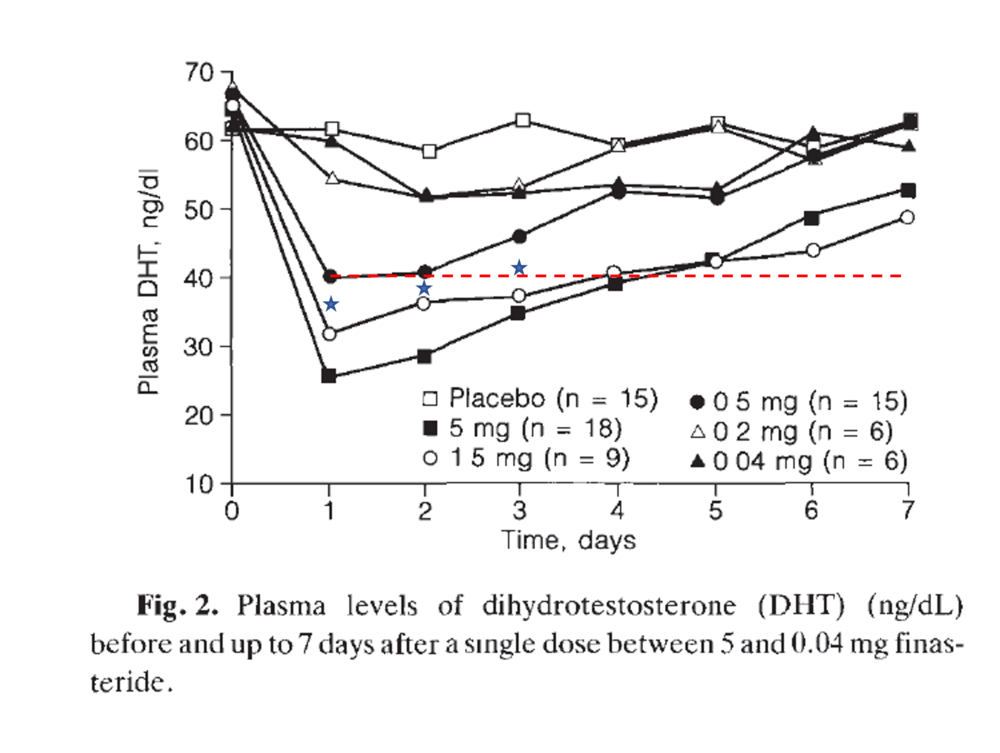 If you use the 0.5mg and 5mg dose as a proxy for 1mg, it would appear that serum DHT levels, and by extension tissue levels, only begin to significantly rise three days after the dose.