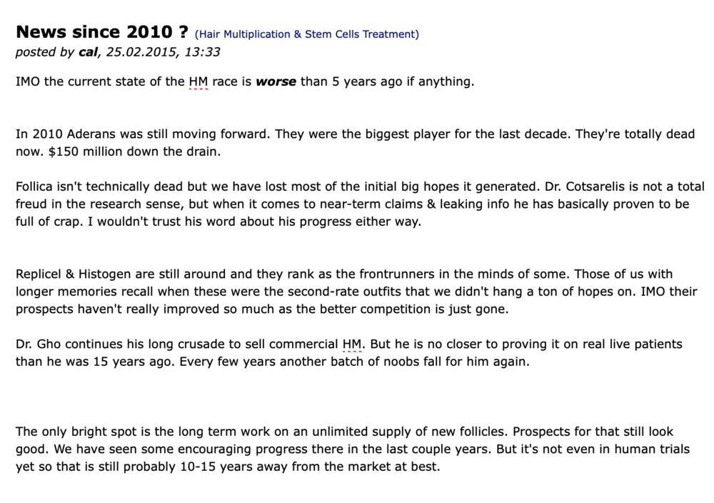 Follica isn't technically dead but we have lost most of the initial big hopes it generated. Dr. Cotsarelis is not a total freud in the research sense, but when it comes to near-term claims & leaking info he has basically proven to be full of crap. I wouldn't trust his word about his progress either way.