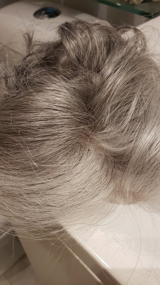 as my custom order is still delayed, i decided to give this NAIR hair removal technique a try. Saw a video on another hair loss forum. Given I wear synthetic grey, mixed with 20% of 1B human, and that my custom color is 100% grey at front and 80% at back, I decided to buy a stock 80% synthetic grey, with a higher than usual density. Applied NAIR to the front hairline only ( about on inch wide, temple to temple) Was afraid that synthetic or lace would disolve, but, to my joy and excitement, only black human hair got disolved ,( OK had to pull lots on hair to dislodge it) ..