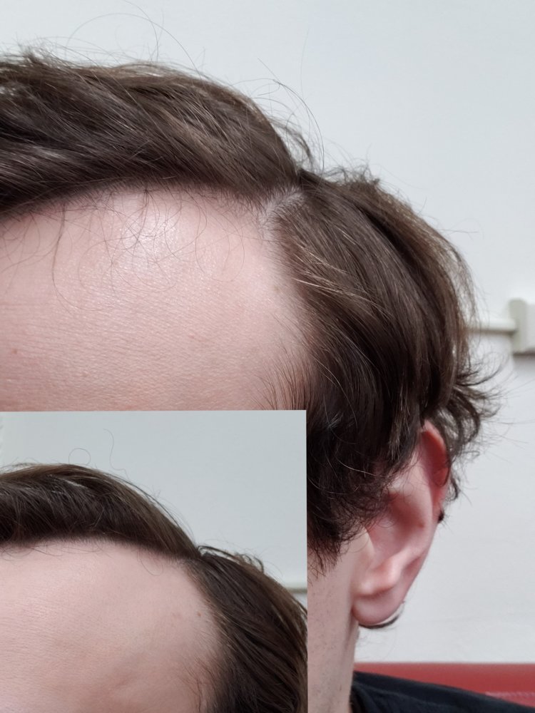 After about 4 months of finasteride I wasn't sure where I stood. Couldn't tell if I had gained, maintained, or lost at that point, so I decided to try minoxidil foam. I gave it a good go for 10 days, twice a day on my hairline and temples. I stopped using it because I got a bit of redness and itching where I applied it, which went away after about 2 days of stopping. So here is where I am. Is it possible I put too much on? I'm not sure how much I was using but I wanted to make sure I covered the problem areas and it's hard to quantify with the foam. Would one application a day suffice or should I try switching to the liquid? I don't think it's an allergic reaction, the redness was more pronounced in the edge of the hairline where it's thinner. I'll also attach a couple comparisons to see if you guys think I've lost hair since starting finasteride. The inset or smaller pic is the "before". This is how I compare, if that doesn't work for you I can upload them separately.