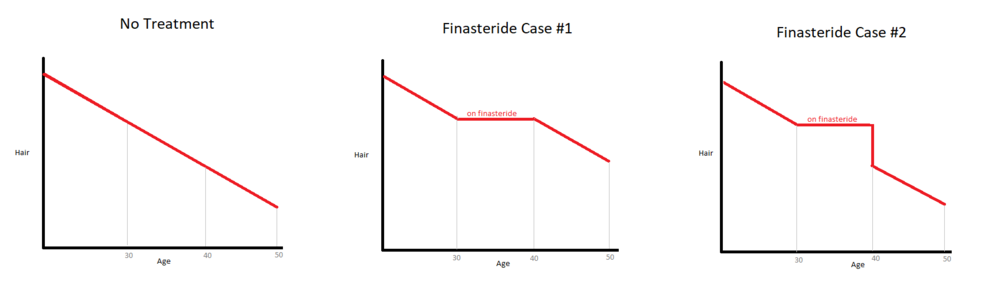 Assume the left graph is your natural progression of hair loss without treatment intervention. If you start taking finasteride at age 30 then stop at age 40, which finasteride graph more accurately represents what your hair loss progression will look like after age 40? Case #1 or Case #2?