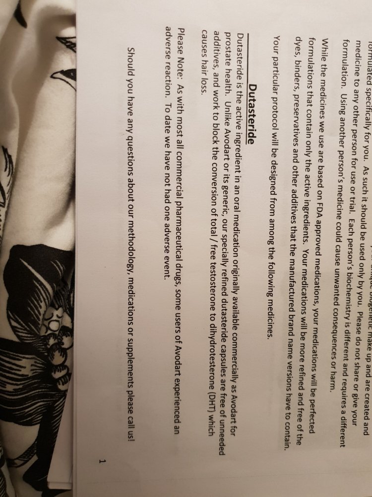 It was not until my son and husband arrived home that I discovered he was on Dutasteride. I was horrified and upset and it took less than 24 hours for me to take him off the drug, despite the reassuring paper work my husband gave me reporting no incidence of side effects. At no stage did I want him to be on this stuff. I am yet to speak to the prescribing clinic as they have a holiday weekend.