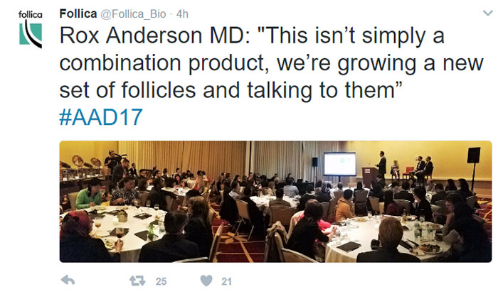 In attendance were Dr. Ken Washenik, Dr. George Cotsarelis, Dr. R. Rox Anderson, and the CEO of Follica, Jason Bhardwaj.