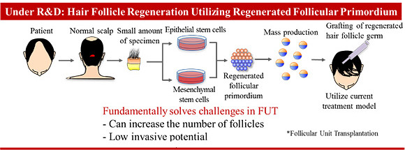 This partnership in Japan formed, based on the research of Dr. Tsuji, who is the team leader of the laboratory for organ regeneration at the RIKEN Center for Developmental Biology. His research back in 2012 showed that by removal of two types of stem cells from a human hair follicle it was possible to induce a brand new fully functional human hair follicle in a rodent model3.