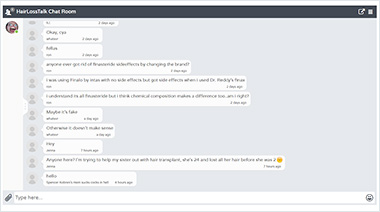 Chat rooms are a great way to get your questions answered in real-time by others who may know a lot about treating hair loss. We have nightly evening chats, and a larger chat on Sunday evenings. Come on in. Someone’s bound to show up.